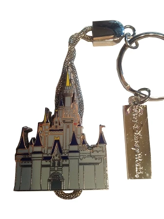Carry along the Happiest Place on Earth with this very neat Cinderella’s Castle Keychain Dangle. Features a detailed Castle that dangles by a silver braided chain, and has a Walt Disney World metal tag.