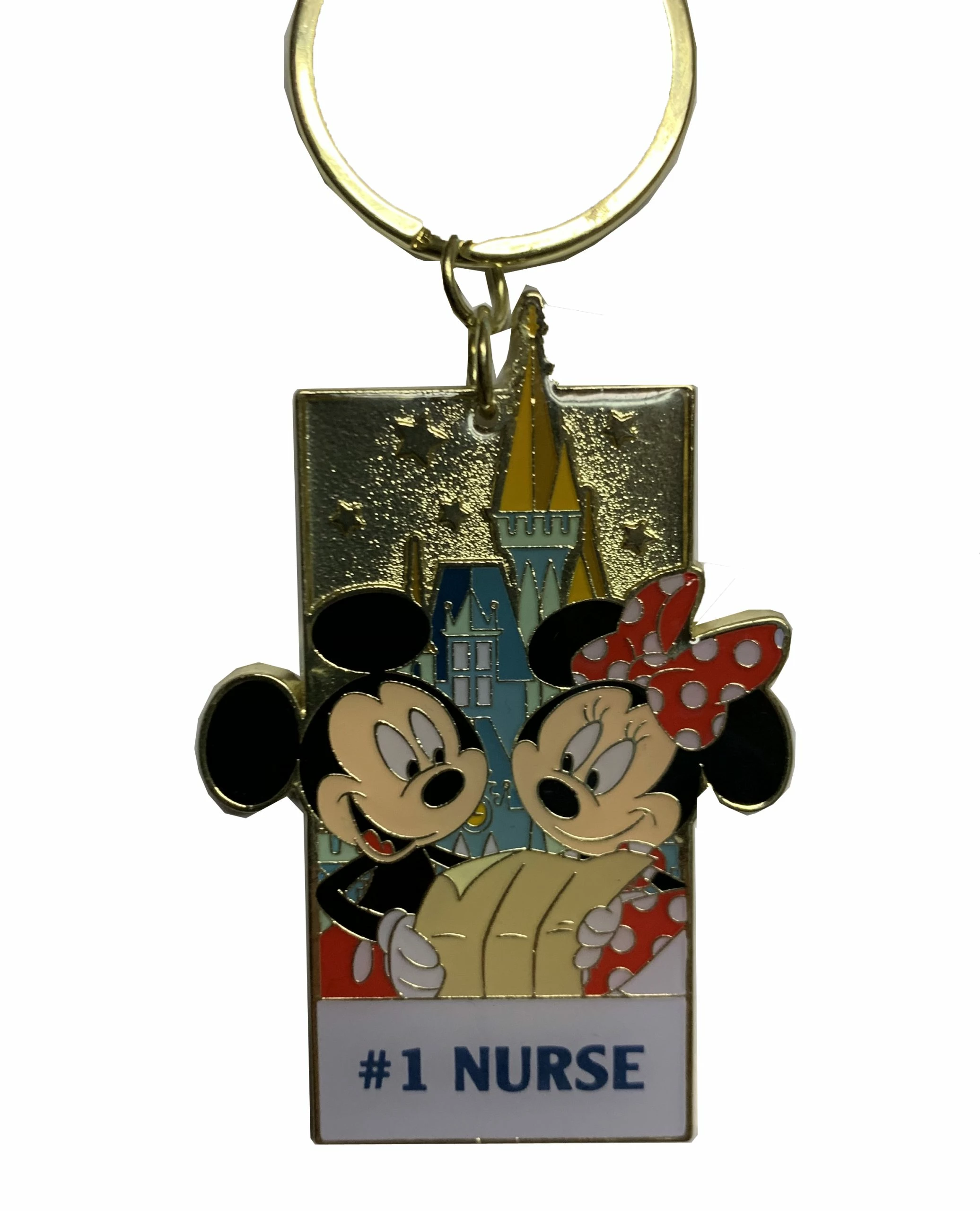 This fun Keychain Features Mickey and Minnie with Cinderella’s Castle, with the wording of your choice.Â