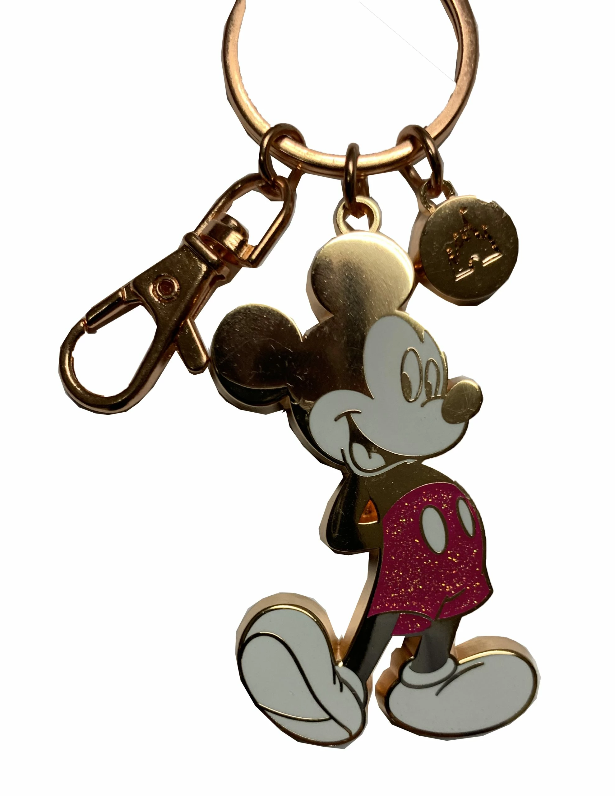 Bring along Mickey Mouse on your travels with this durable Keychain. Features Mickey Standing with his sparkly shorts, in a Rose Gold Color.Â