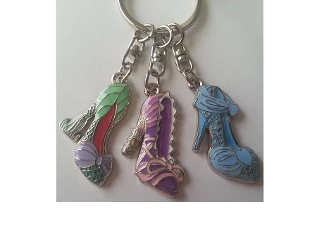 Glamor up your Keys with these Three Princess Shoes. Features Rapunzel, Cinderella, and Ariel metal shoe charms.