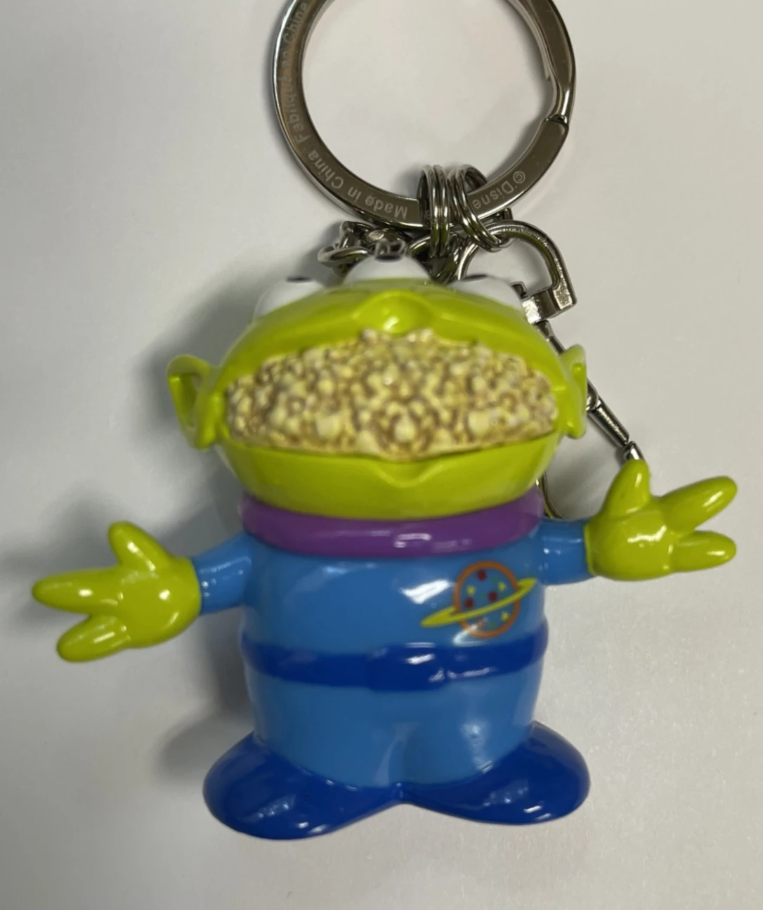 Enjoy your memories of fresh Mainstreet Popcorn with this fun Keychain. Features The Toy Story Alien popcorn bucket showing popcorn in his mouth.